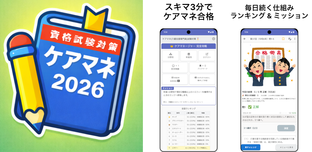 「ケアマネ 試験」の一問一答形式の過去問題集(アプリ)です。