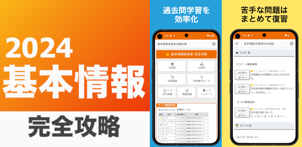 この基本情報技術者試験対策アプリは、皆さまが時間を無駄にせずに、効率的に試験を突破してもらうために、自身の基本情報技術者をはじめとする数々の情報処理技術者試験を受験してきた経験や15年以上のIT業界経験をもとに様々な工夫を凝らしています。